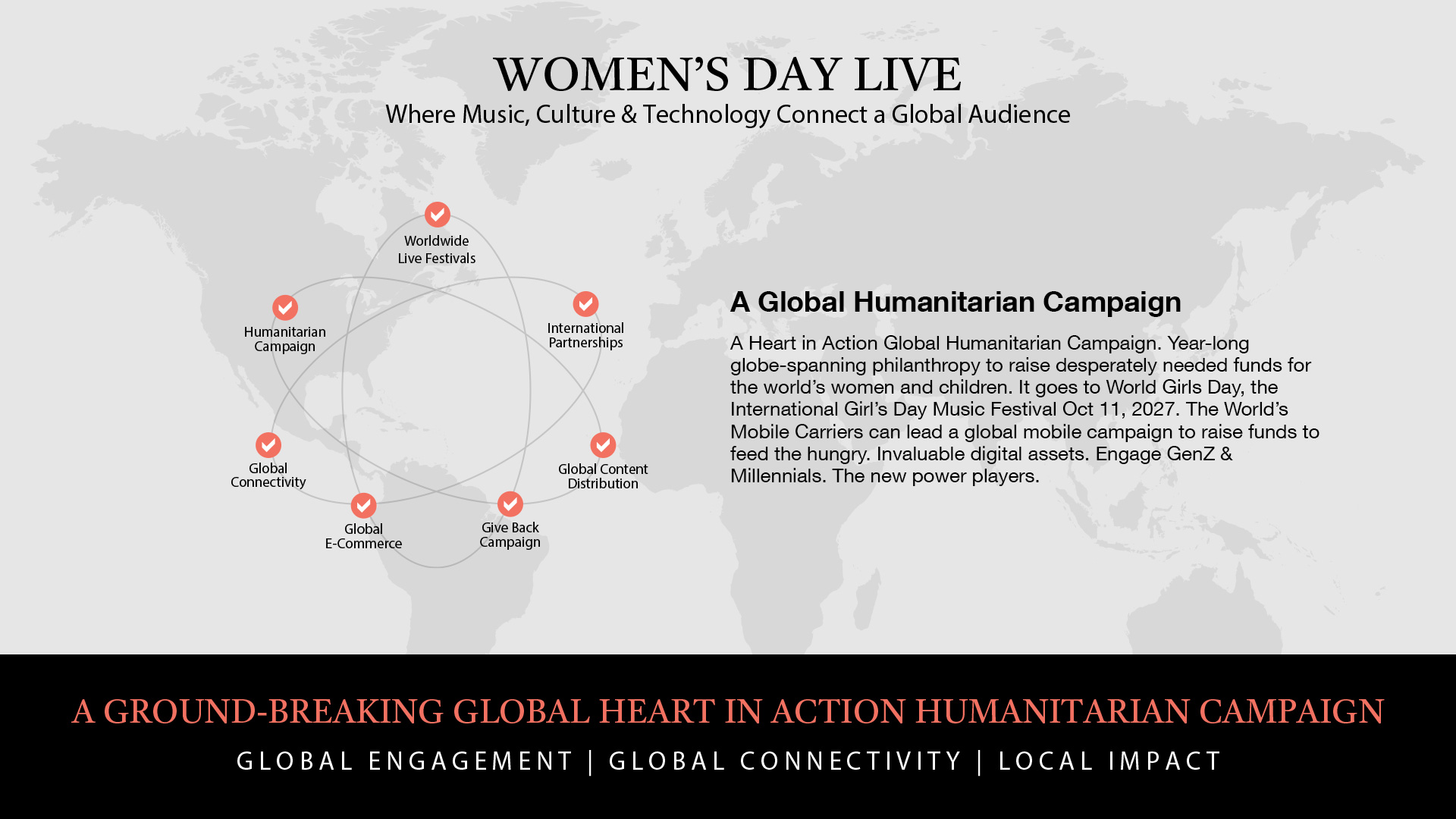The Heart in Action Global Campaign will continue for the World Girls Day Concert on International Girl’s Day October 11, 2027. See Activate Plan G overview to mobilize a global movement for women’s and girls education and economic empowerment. It is both an overarching campaign idea and a global call to action.